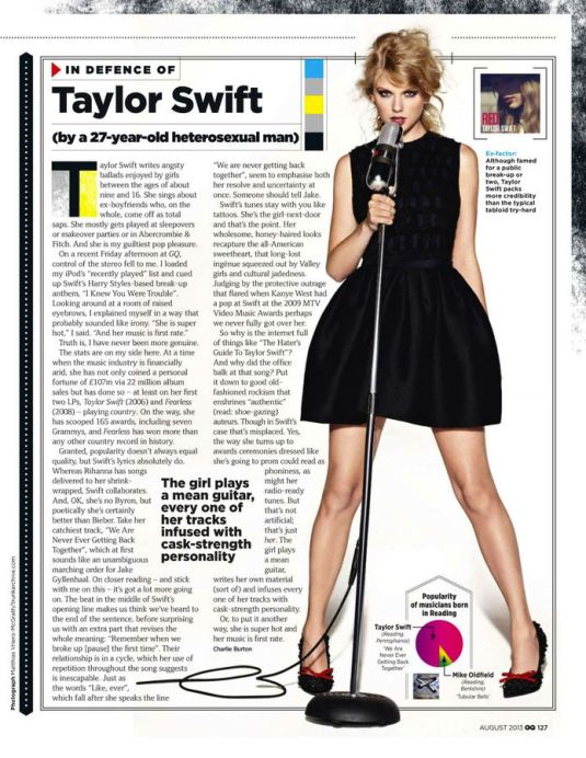 On a recent Friday afternoon at GQ, control of the stereo fell to me. I loaded my iPod’s “recently played" list and cued up Swift’s Harry Styles-based break-up anthem, “I Knew You Were Trouble". Looking around at a room of raised eyebrows, I explained myself in a way that probably sounded like irony. “She is super hot,“ I said. “And her music is first rate.”
